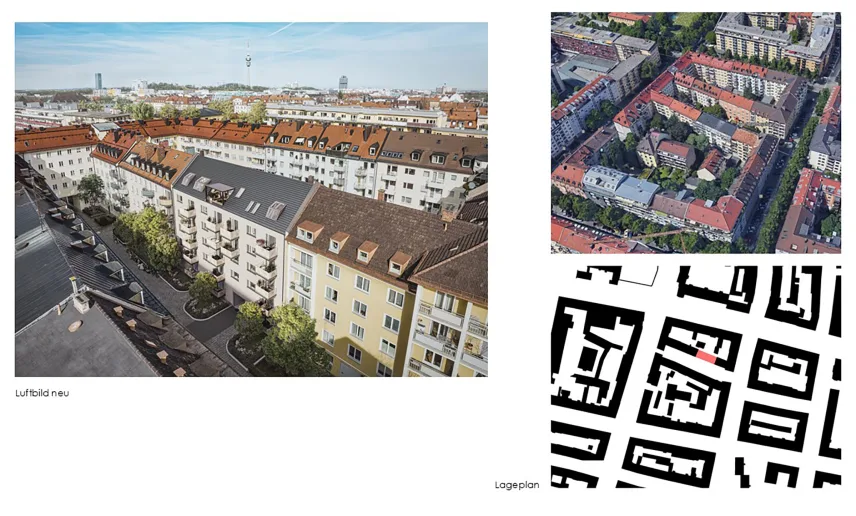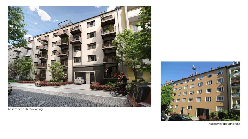 Das Gebäude aus der Bauzeit Mitte der 1950-er Jahre besteht aus zwei sechsgeschossigen Wohnhäusern mit 17 Wohnungen in bester Lage mitten in Münchens Schwabing-West zwischen Olympiapark und Englischen Garten.