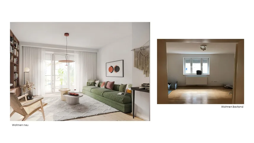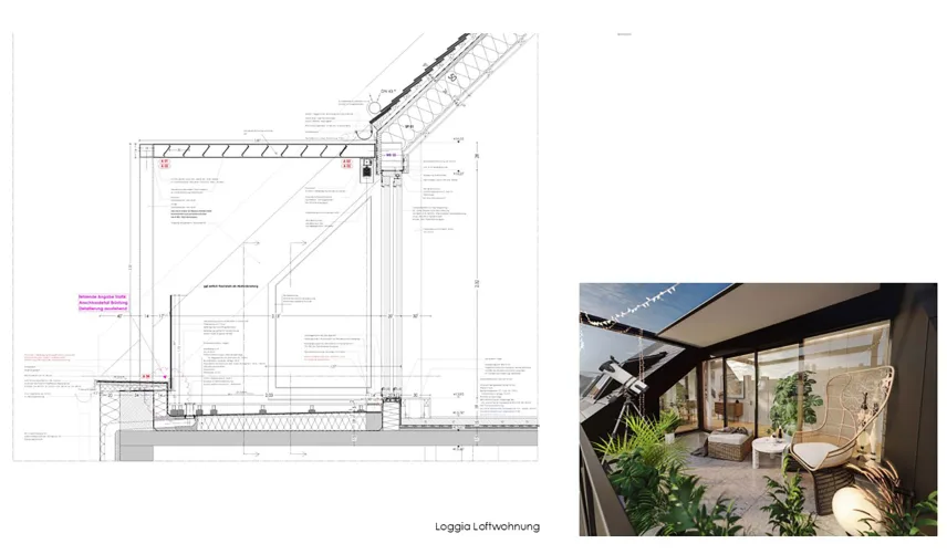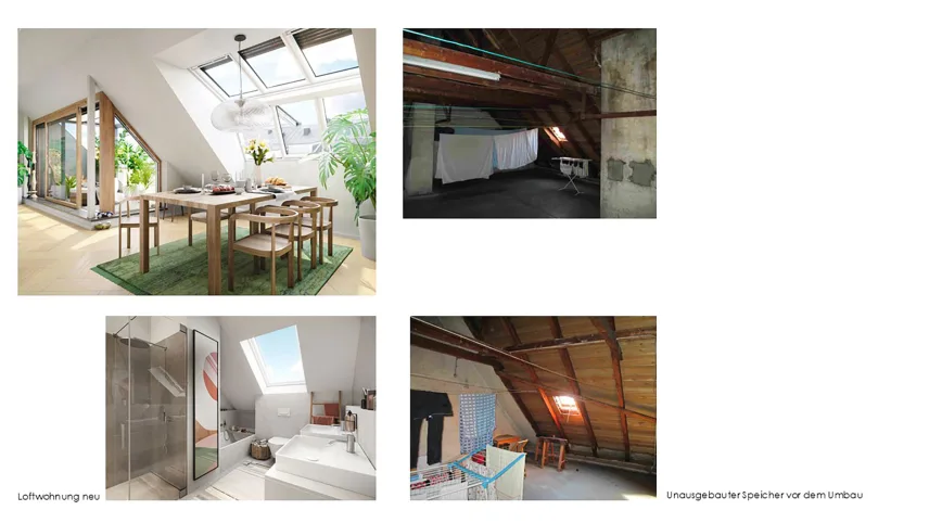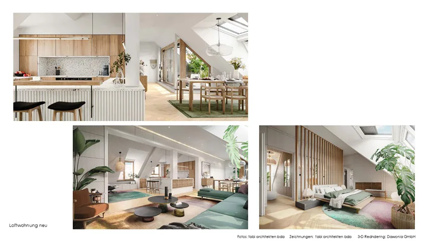 Der im Bestand nichtausgebaute Dachraum wurde minimal angehoben und zu einer großen, hochmodernen, hellen Loftwohnung mit 6 Zimmern, 2 Bädern und großer Dachloggia umgestaltet.