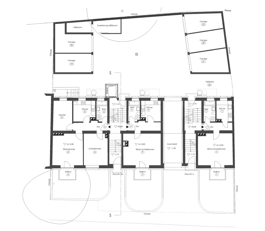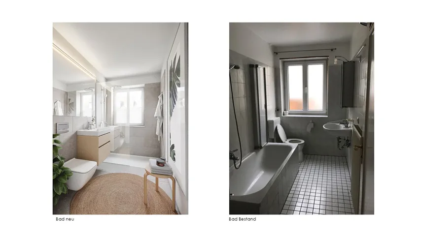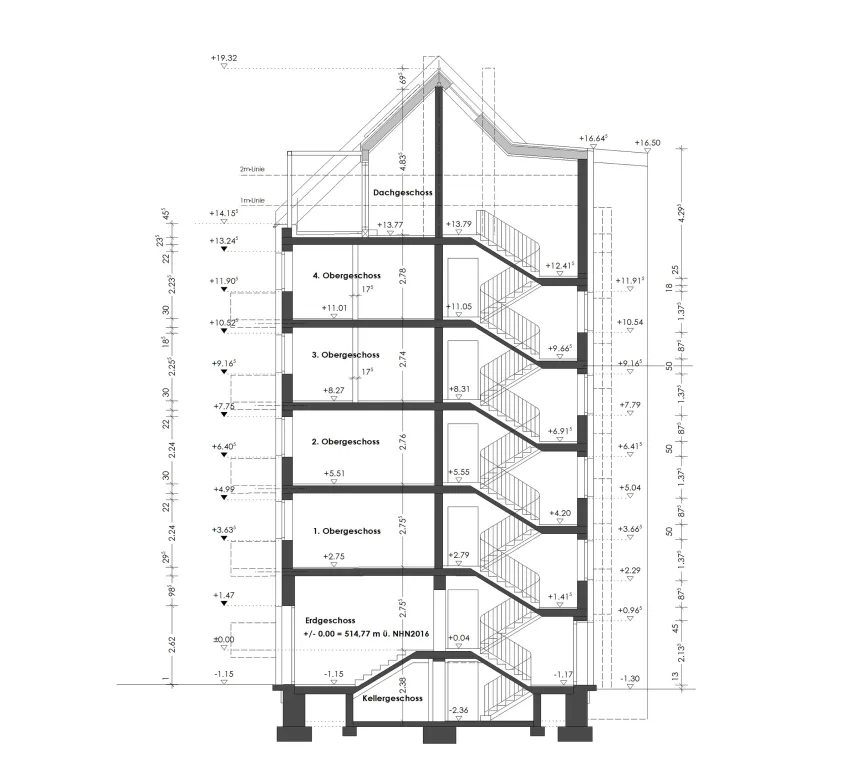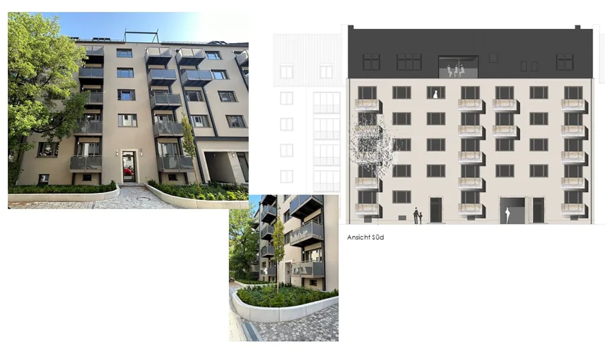 eine zeitgemäße Wohnqualität zu schaffen, welcher der besonderen urbanen Lage entspricht. Dies erforderte, das Gebäude in den Rohbauzustand zurückzuführen und komplett Kern zu sanieren. Die bereits guten Grundrisse des Bestands wurden durch geringfügige Eingriffe modifiziert und verbessert. So wurden die Küchen und Bäder vergrößert und somit deren Nutzung für die Bewohner deutlich verbessert. Alle Wohnungen erhielten eine Freifläche in Form von großzügigen Balkonen zur Südseite. Im Innenhof wurde ein Glasaufzug erstellt, der die Erreichbarkeit der Wohnungen verbessert. Die Treppenhäuser aus den 1950 Jahren wurden behutsam saniert und die Sicherheitsanforderungen der Geländer zeitgemäß adaptiert.