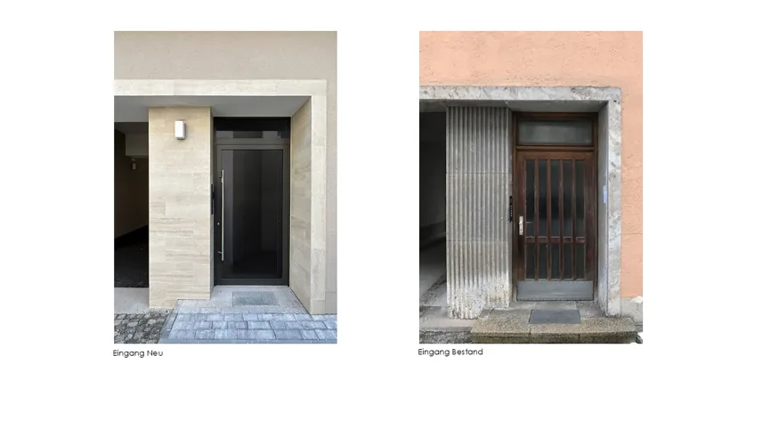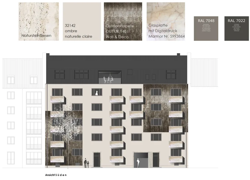 Die bestehenden Natursteinelemente (Tor-und Türeinfassungen) werden gestalterisch beibehalten, ebenso die Natursteinwandverkleidungen im Treppenhaus. Diese strahlen eine natürliche und hochwertige Wirkung bereits im Bereich der Eingänge aus. Diese Thematik wurde für die weitere Farbgebung der Fassade aufgegriffen und der Farbton dem Naturstein entspr. angepasst. Die Fensterrahmen, sowie die metallischen Elemente im Bereich der Fassade sind in einem Bronzefarbton gehalten und heben die Wertigkeit der Gesamtgestaltung weiter an. Die Brüstungselemente der Balkone sind in Rauchglasoptik, leicht transparent für mehr Raumbelichtung, aber dennoch blickgeschützt ausgeführt. Das natürliche, harmonische und schlichte Zusammenspiel der Materialien, wird bei der Innenraumgestaltung weitergeführt.