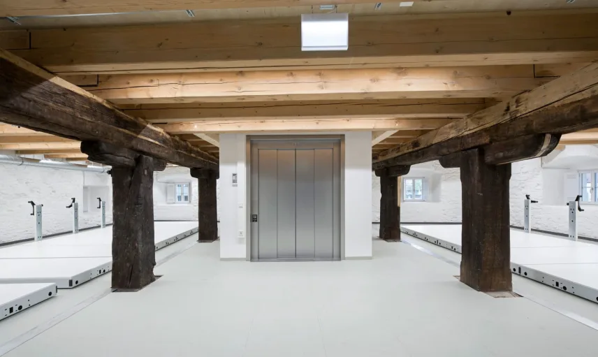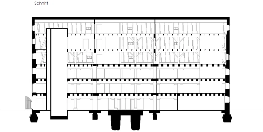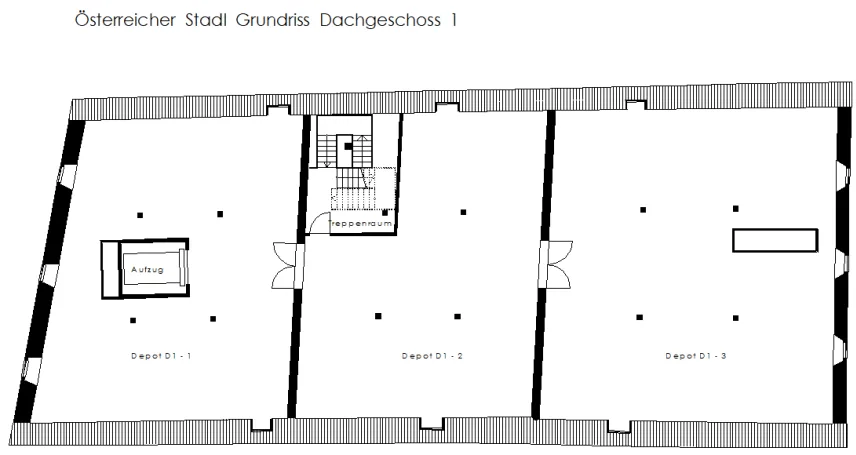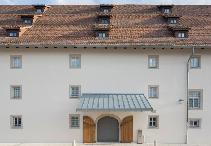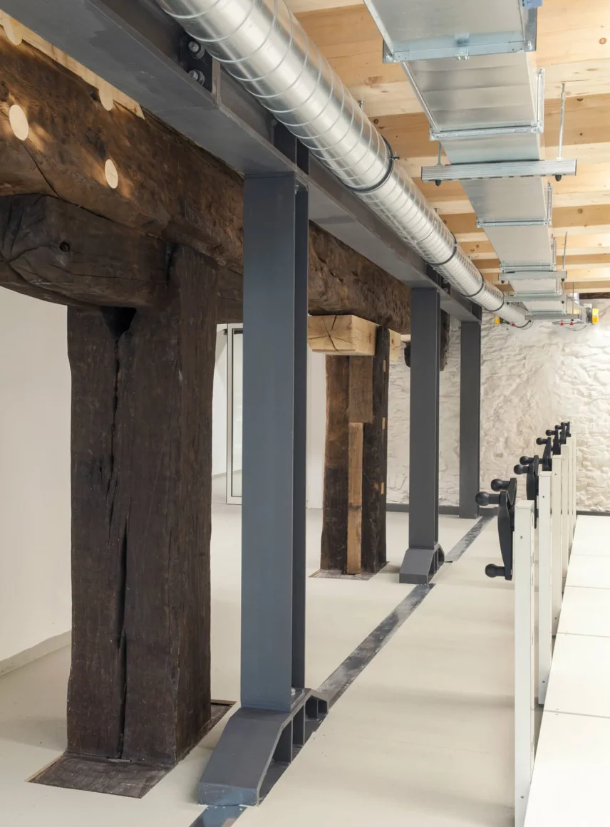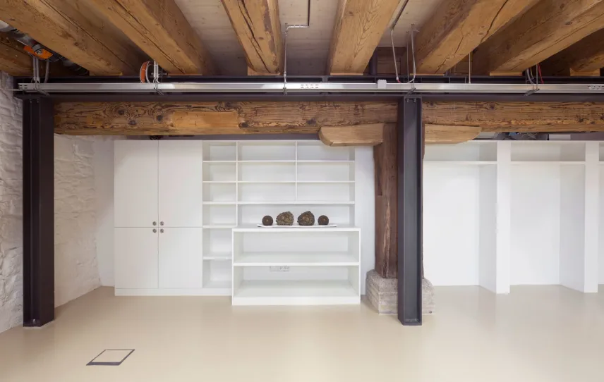 The so-called "Austrian barn" at the river danube in Regensburg (UNESCO world heritage) was first mentioned in 1653 and rebuilt several times over the centuries. The mighty, historical, listed building was u.a. used as salt storage and has now been renovated as a museum depot for the new Museum of Bavarian History. With 18 x 40 m outside masses, 3 normal floors and 3 attic floors and 18 m height, the building is a powerful building volume directly on the Danube bank. The aim of the refurbishment was, on the one hand, to provide exemplary monumental upgrading of the existing building components and to add the structures to be created clearly legible to the historical inventory.