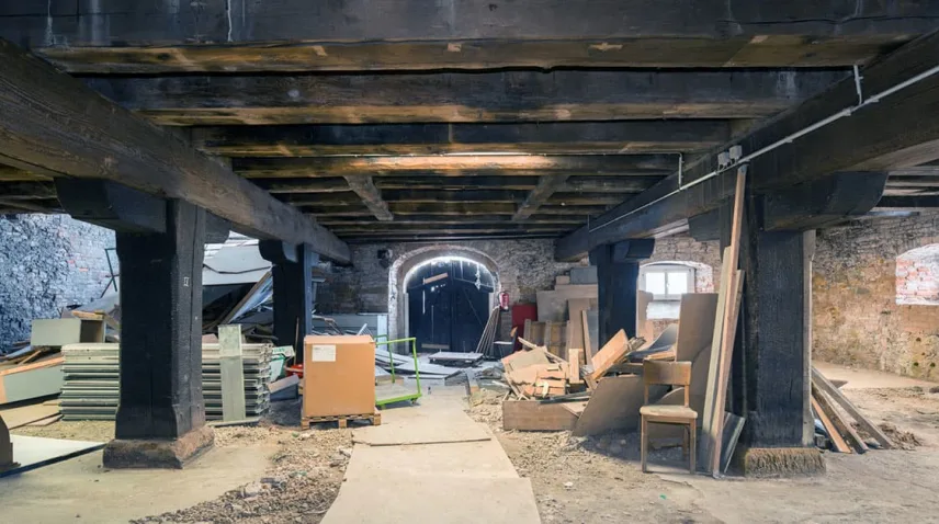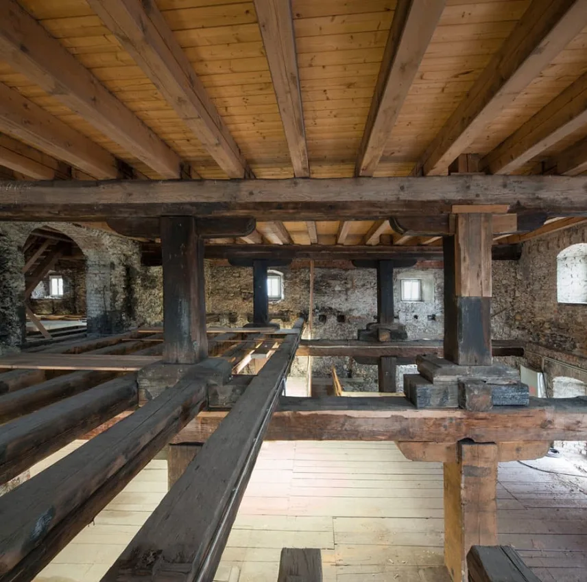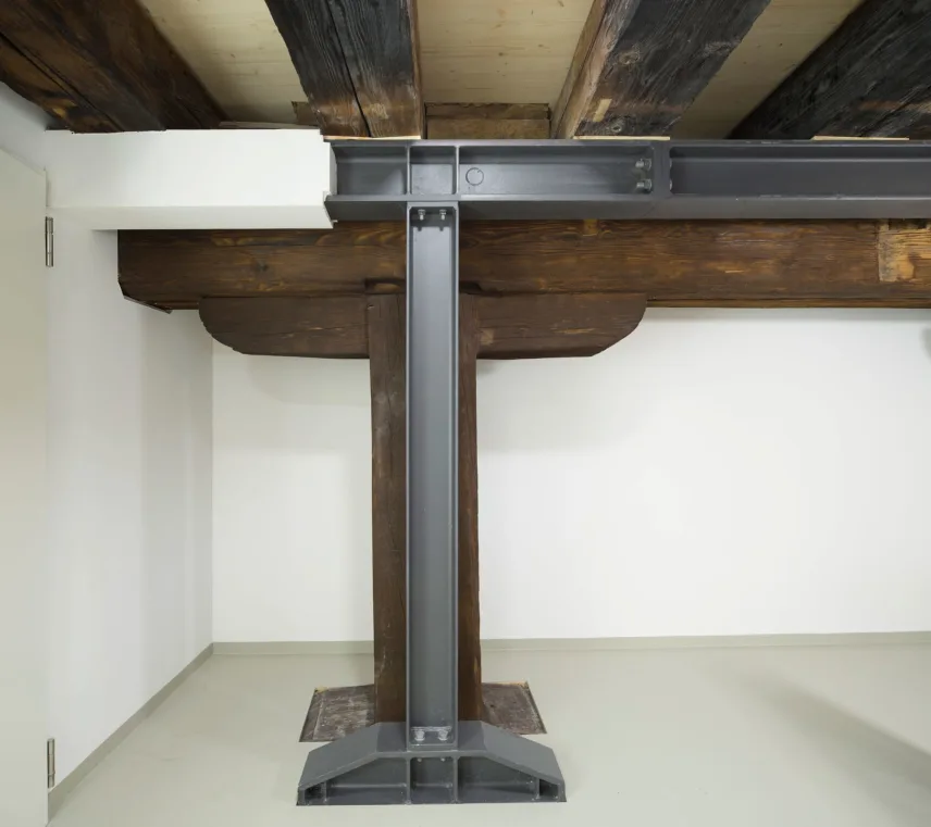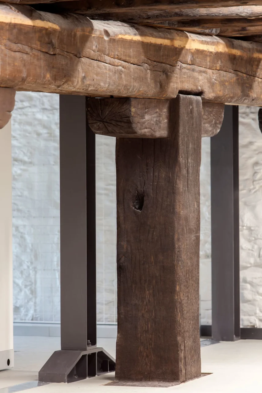 Die Balkenköpfe der historischen Holzkonstruktion waren bis zu 80 % geschädigt. Bei den Holzunterzügen zeigten sich stellenweise beträchtliche Durchbiegungen infolge der Belastung durch die historische Nutzung als Salzlager. Außerdem waren vor allem der teilweise noch originale Holzdielenbelag, aber auch einige Balken, mit Holzschädlingen befallen. Beim Brand im Jahre 1988 wurde das Holztragsystem stark angegriffen. Die geschädigten historischen Holzbauteile wurden durch Brettschichtholzbalken, mit zimmermannsmäßigen Holzverbindungen, denkmalgerecht saniert bzw. ergänzt. Die neue Deckenunterkonstruktion auf dem Holztragsystem besteht aus Brettsperrholzplatten, die die zugleich notwendigen statischen Funktionen und den erforderlichen Brandschutz erbringen.