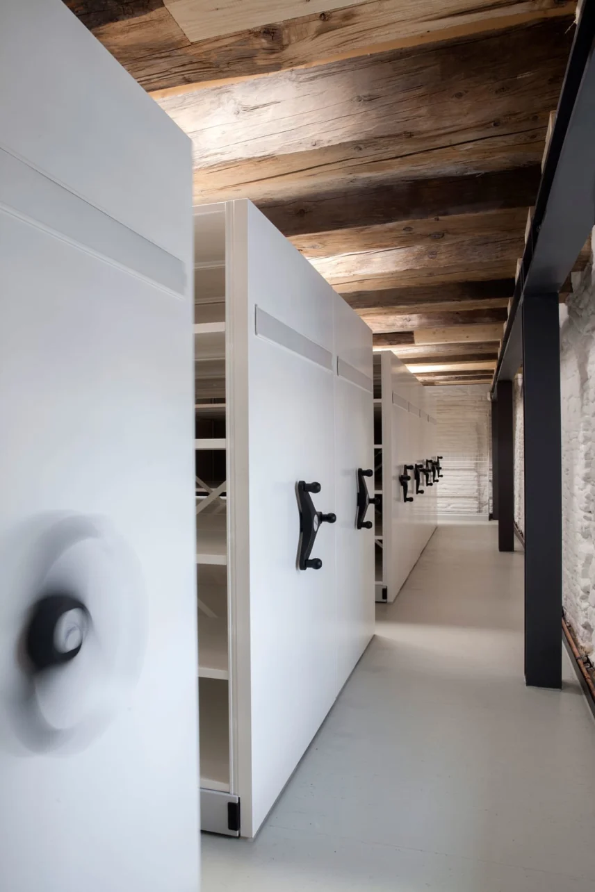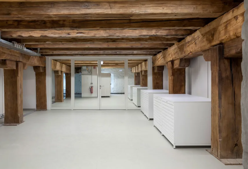 Die Depotbeleuchtung ist nach Lichtfarbe und Beleuchtungsstärke genau auf die Depotnutzung abgestimmt. Die in den Depotbereichen erforderlich Raumtemperatur von mindestens 14° C bzw. das notwendige Raumklima mit einer relativen Luftfeuchte zwischen 40 und 60%, wird mit einer intelligent gesteuerten Lüftungsanlage sichergestellt. Die Temperierung der Depotbereiche erfolgt mittels Heizregister in den zentralen Lüftungsgeräten. Die Bauteilaktivierung in der Bodenplatte im Erdgeschoss ermöglicht die Einregulierung der benötigten Temperaturen, abgestimmt auf die unterschiedlichen Lager- bzw. Arbeits- und Aufenthaltsbereiche. Auf Grundlage einer in der Planungsphase durchgeführten Klimasimulation konnte auf eine Kühlung und Entfeuchtung verzichtet werden.