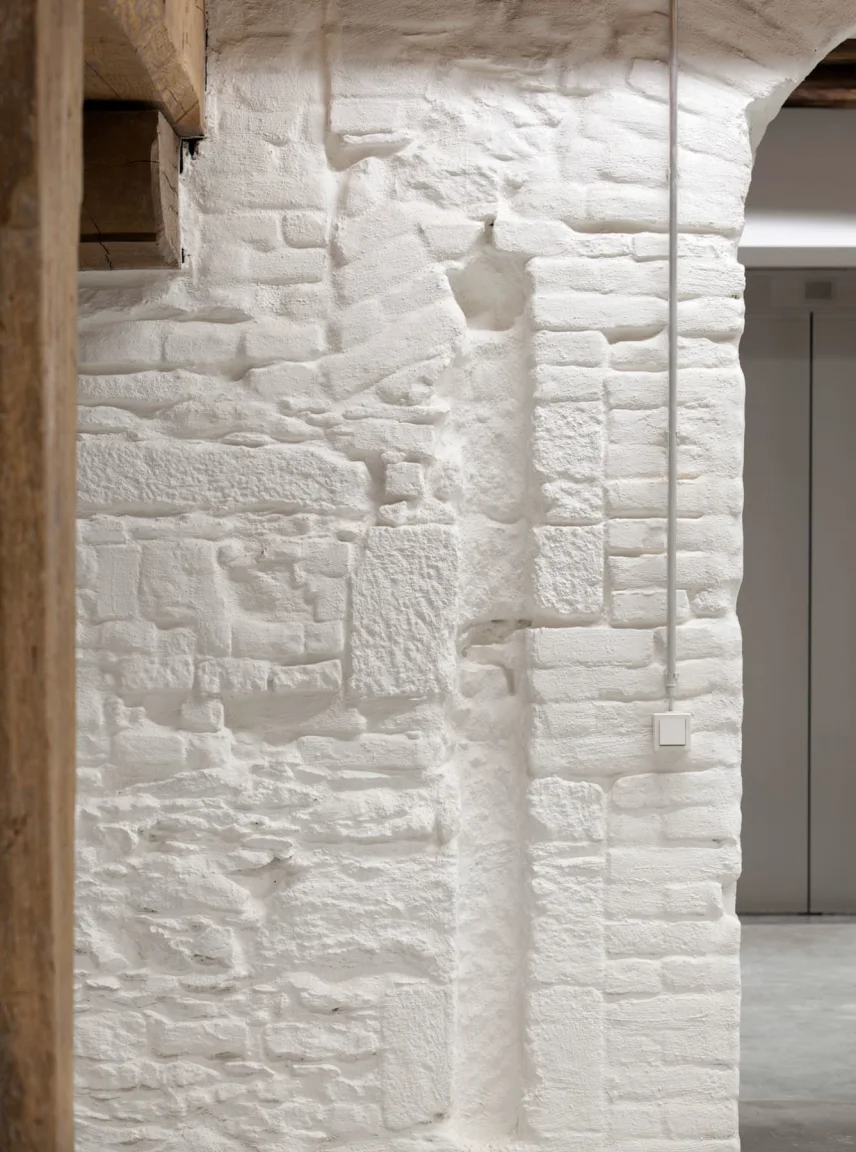 Das Mauerwerk zeigte in Teilbereichen starke Rissbildungen, die mit einer Trasszementsuspension verpresst werden mussten. An den Innenwänden in voller Höhe und im Sockelbereich der Außenwände, ist aufgrund der hohen Salzbelastung ein speziell abgestimmter Salzspeicherputz zum Einsatz gekommen. An den Außenfassaden wurde zusätzlich ein rein mineralischer Wärmedämmputz auf Romanzementbasis aufgetragen.