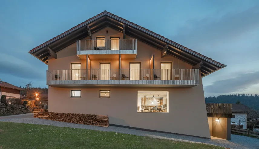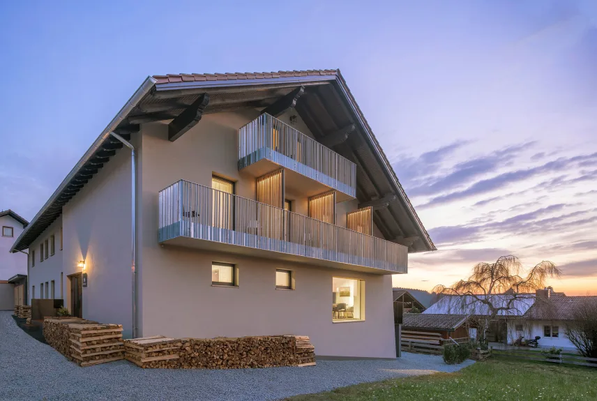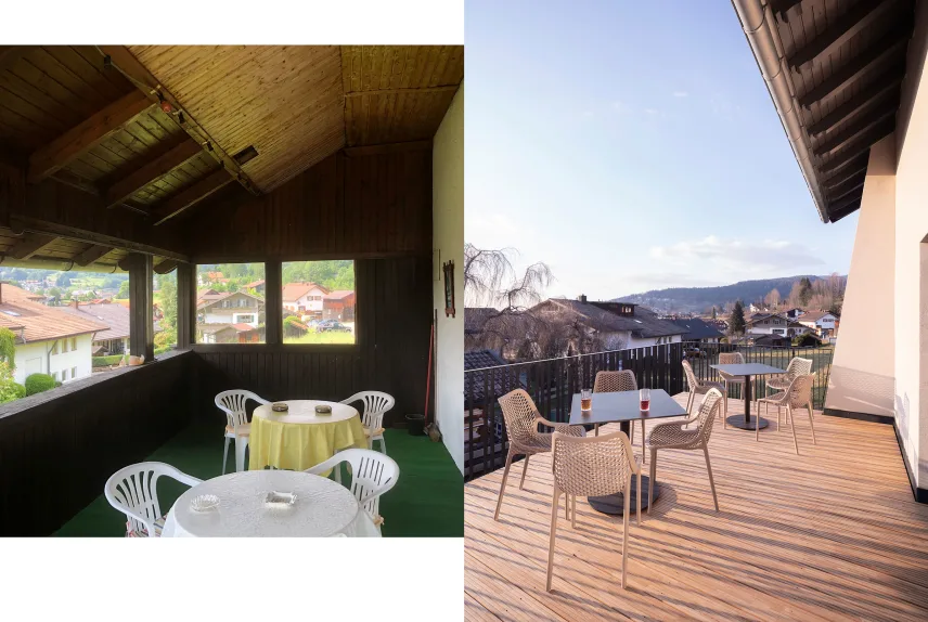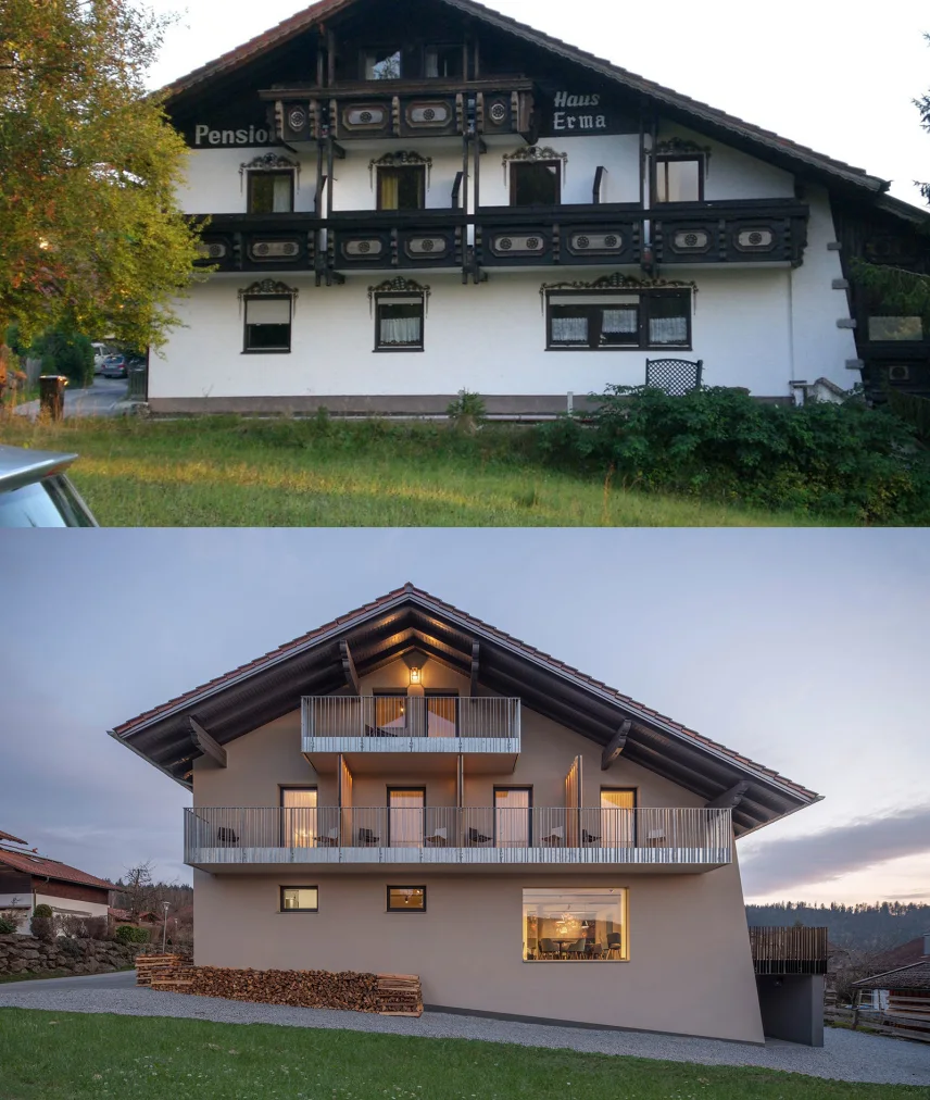 Das sehr in die Jahre gekommenes Gästehaus “Haus Erma“ Baujahr 1965 sollte gestalterisch attraktiv, nachhaltig , modern und wettbewerbsfähig in die Gegenwart und weiter in die Zukunft gebracht werden. Es ist für uns ein Beispielprojekt für viele leer stehende Gebäude im bayerischen Wald mit ähnlichen bauzeitlichen Strukturen, zeigt eine Alternative zum Abriss auf und geht ressourcenschonend mit Platz und Entsorgungsproblematiken um.