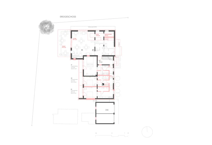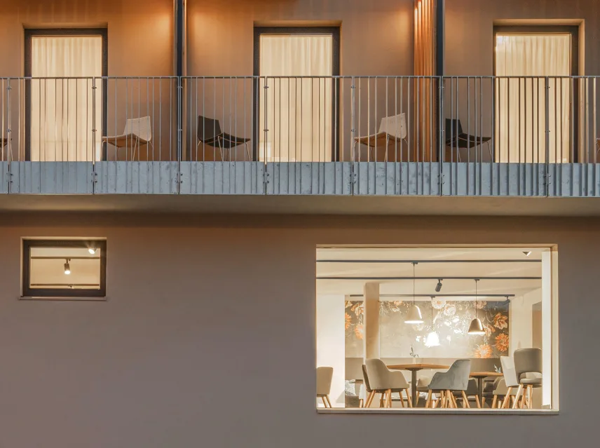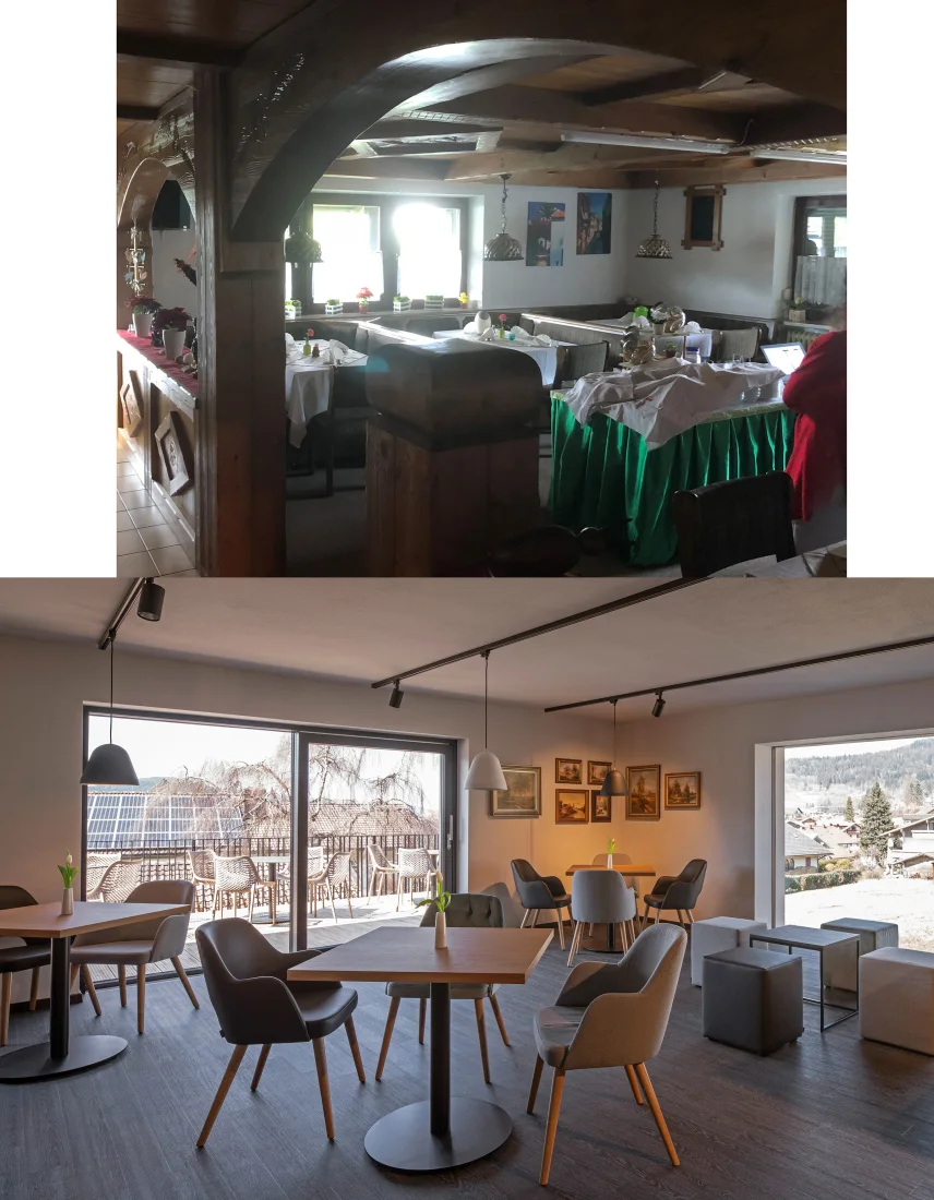 Aus Wirtschaftlichkeits- und Betreibergründen wurde die Rohbaugrundstruktur im Bereich der Außenwände nicht verändert und auch von einer Gebäudeerweiterung abgesehen. In das innere Raumgefüge wurde jedoch stark eingegriffen, so dass die bestehende unschöne Innenflursituation aufgehoben werden konnte und insg. 10 zeitgemäße Gästezimmer, sowie eine große Lounge im EG und ein kleiner Wellnessbereich im UG entstehen konnten. Hierfür wurden grundlegende Eingriffe in die Gebäudestatik vorgenommen. Tragende Trennwände wurden durch Stahlträger ersetzt, die Fensteröffnungen um den Brüstungsbereich vergrößert. Die Räume werden so luftiger, heller, moderner und schlichter.