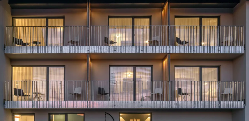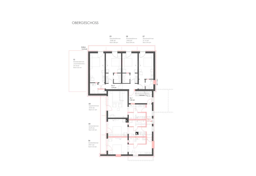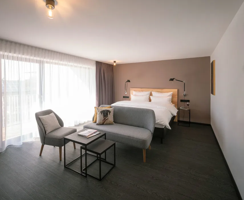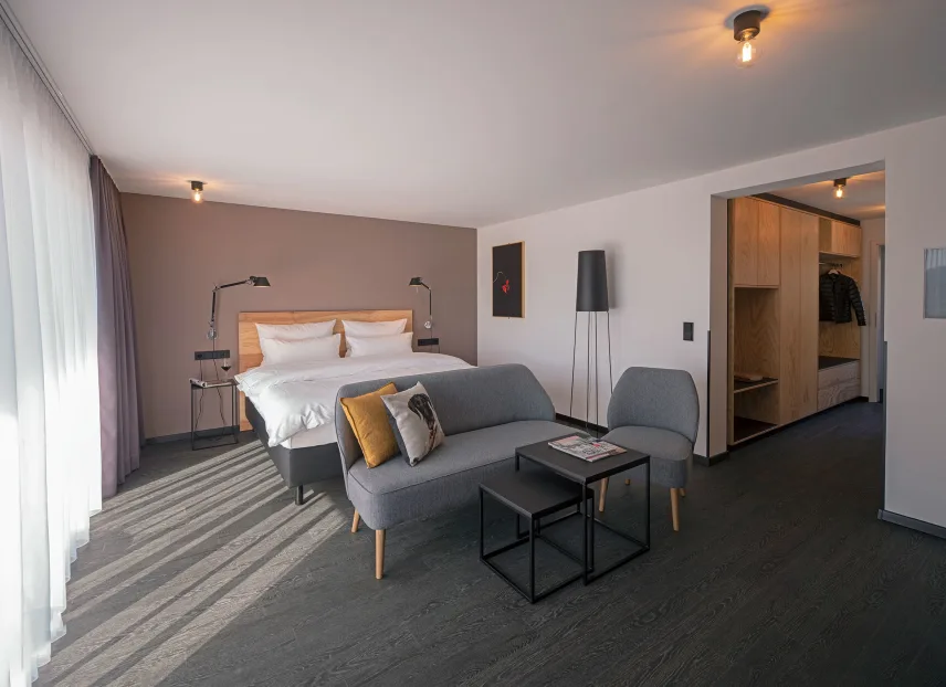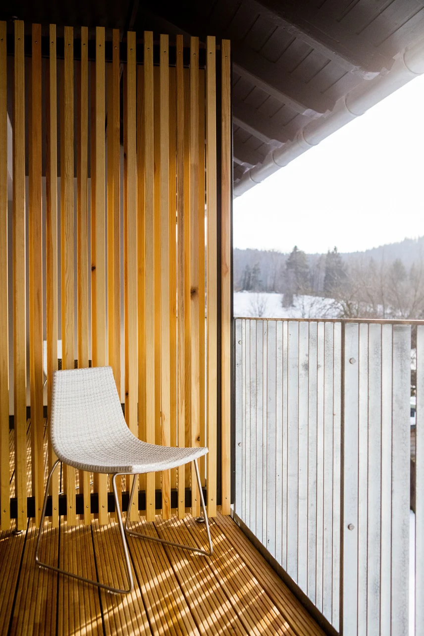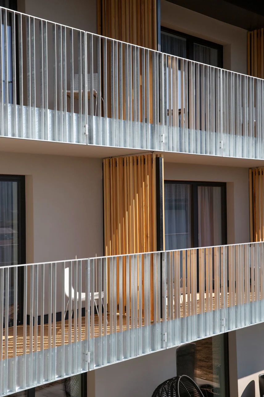 Es wurden 3 verschiedene Zimmerkategorien zwischen 18 und 35 qm geschaffen um ein entsprechend unterschiedliches Nutzerangebot zu erhalten. Diese erhalten einen gemeinsamen Standard mit modernen Bädern, begehbaren Duschen, Sitzmöglichkeiten, großen Fenstern mit Balkonzugang, und ausreichend Ablageflächen. Außerdem sollte ein einheitliches „ Look and Feel“, angepasst an die anderen Bereiche des Hauses umgesetzt werden. Trennwände aus Holzlamellen zonieren die privaten Freibereiche und streuen das Sonnenlicht in die Räume.