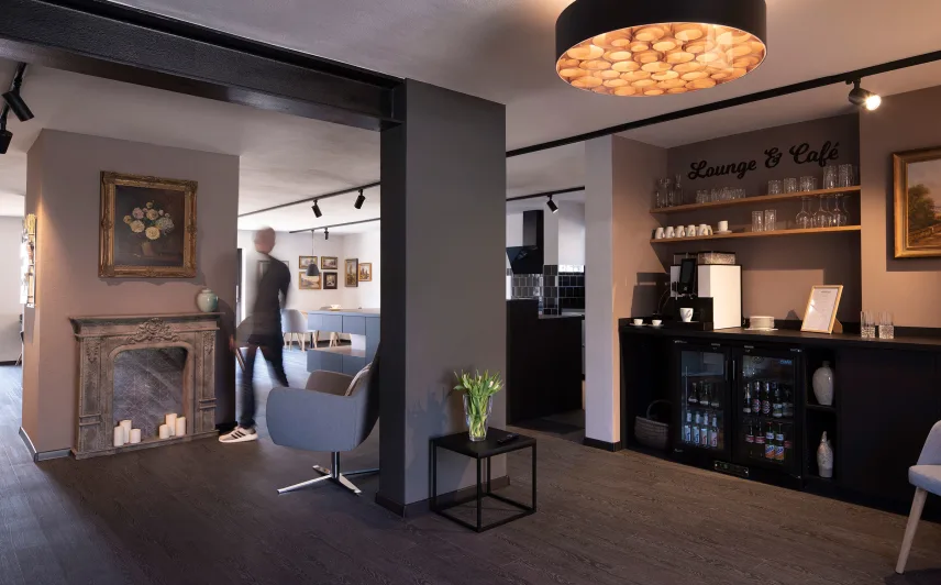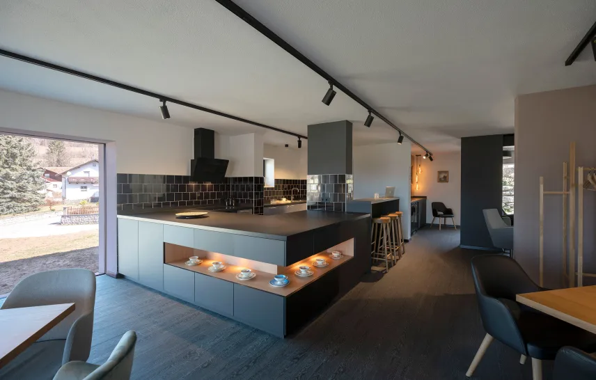 Dieser Bereich sollte besonders vielseitig verwendet werden können. Der große schwarze Küchenblock sollte Rezeptionsbereich, Büffetbereich, Vorbereitungsfläche und Bartresen sein. Die Rückfront verfügt über Herd, Backofen, Spülbecken, Kühlschrank, und Stauraum für Geschirr, Tischwäsche etc. Direkt dahinter schließt eine kleine geschlossene Spülküche an. Die Zertifizierung des Hauses wurde bewusst im Segment Pension eingeordnet um mehr Flexibilität gegenüber den Auflagen eines Hotels- u. Restaurantbetriebes zu haben. Eine „Honesty-Bar“ nahe dem dem Eingangsbereich rundet das Angebot ab und erzeugt Wohnzimmercharakter.