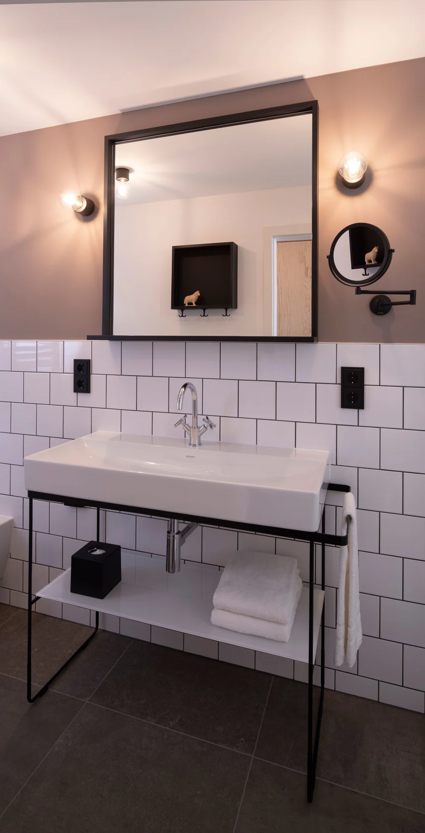 Um Nähe zum Gast und einen maximalen und flexiblen Komfort für den Betrieb gewährleisten zu können wurde für die Gastgeber das Dachgeschoss zu einer Wohnung mit 2 Schlaf-und einem Gemeinschaftsbereich mit offener Wohnküche ausgebaut.