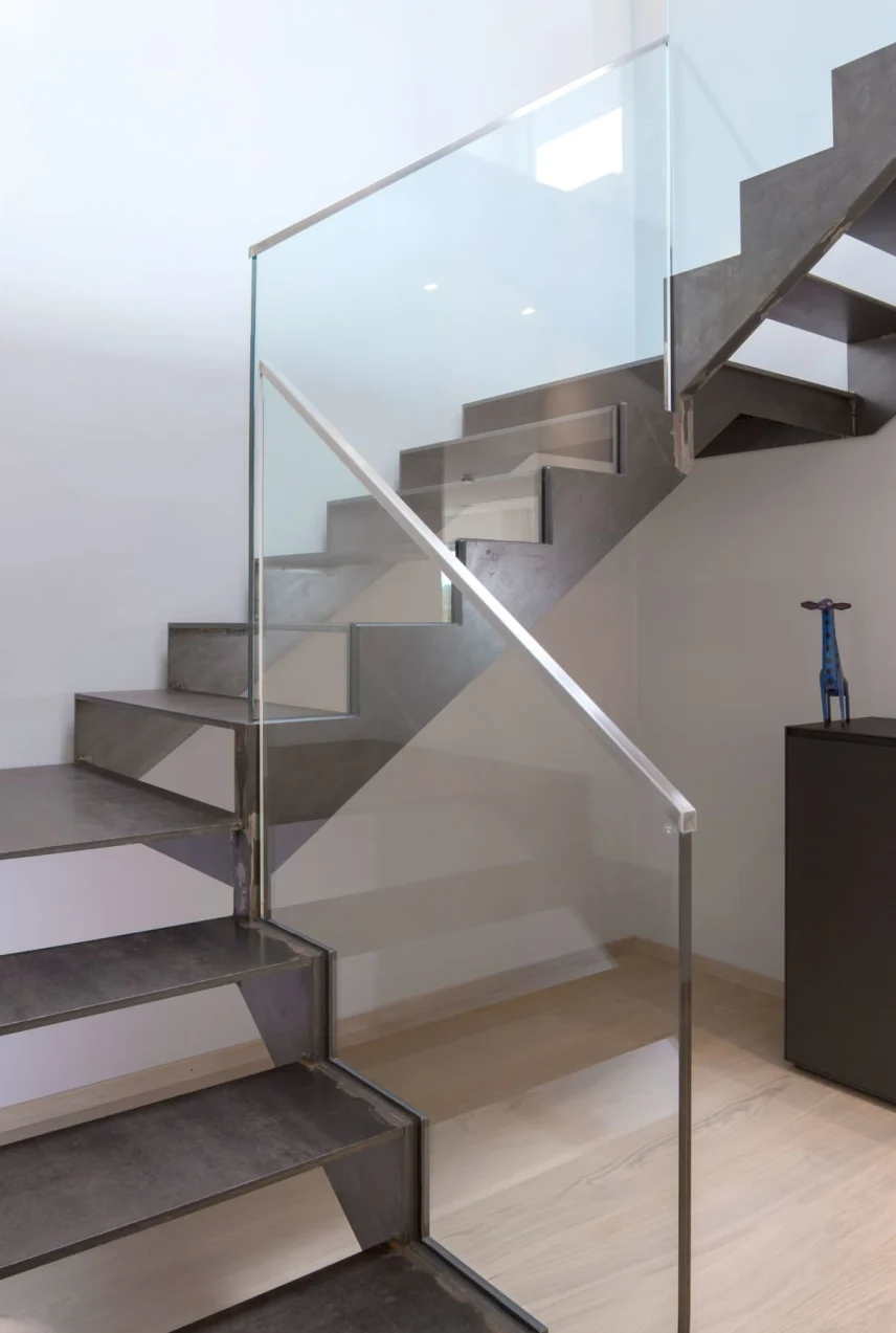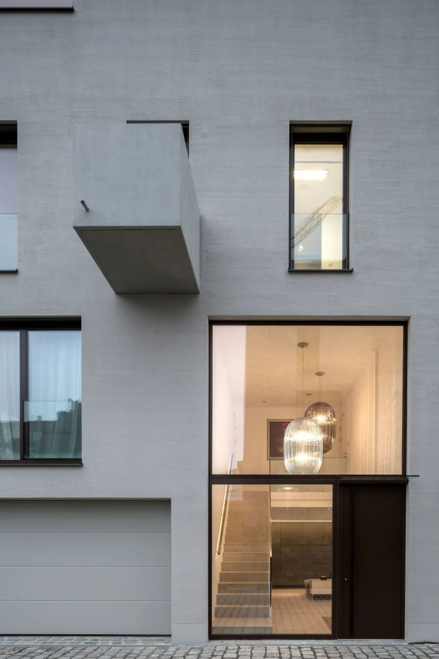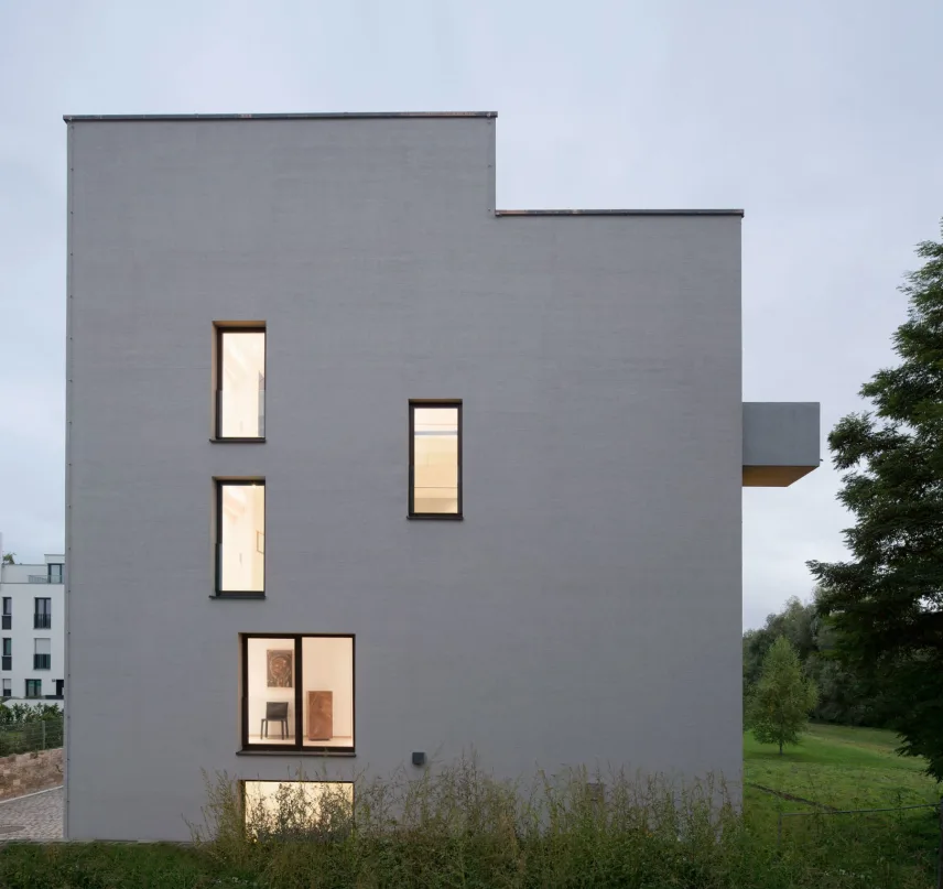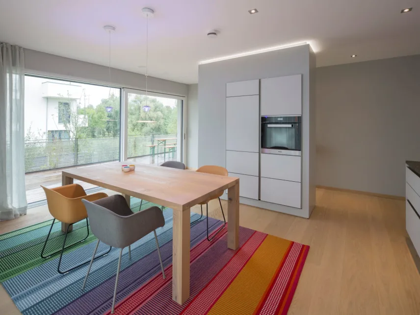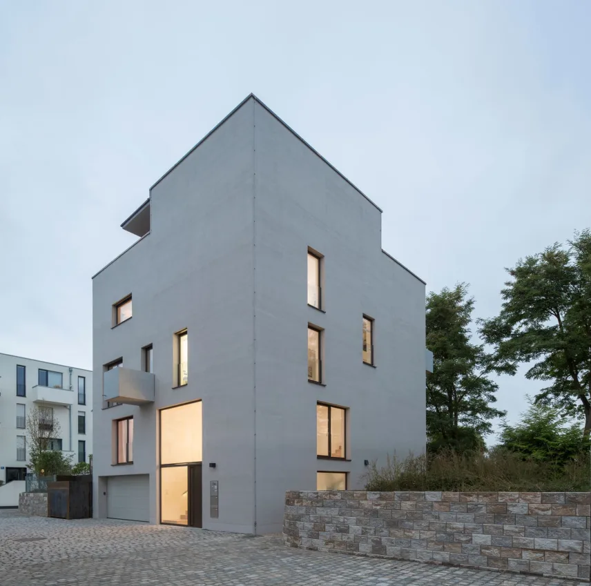 In der ersten Ebene öffnet sich ein zweigeschossiges Eingangsfoyer und lädt den Nutzer ein das Gebäude zu betreten und beide Wohneinheiten zu erschließen. In der 3. Ebene liegen die Schlafräume, Bad, Ankleide und Hauswirtschaftsraum. Von hier gelangt man über die frei kragende Treppe in das Wohngeschoss der 4. Ebene mit Küche, Essbereich, Arbeitsraum und Gäste-WC. Über eine Rohstahltreppe erweitert sich die Wohnung um einen Rückzugsraum im 5.Geschoss. hier gibt es einen Dachzugang mit großer Dachterrasse, Außenküche und 270°-Blick über Regensburg und den Naturraum der Donauauen. Werthaltige Materialien wie Eiche, Kalkstein, Corian, Kupfer, Glas und Rohstahl bilden zusammen mit den technischen Komponenten ein zeitgemäßes Wohnrefugium.