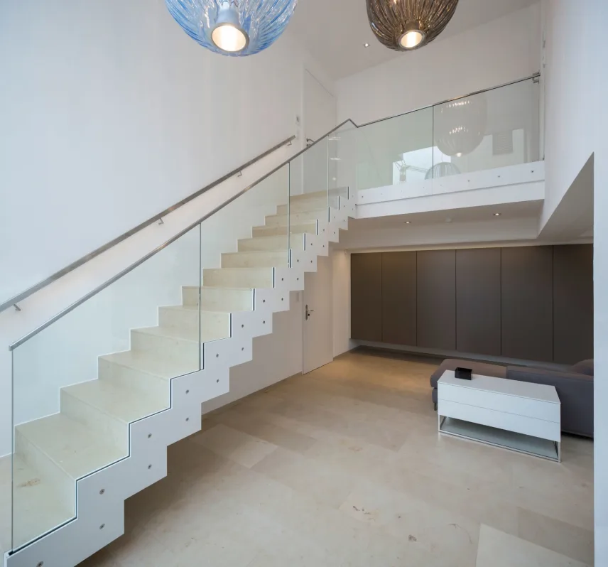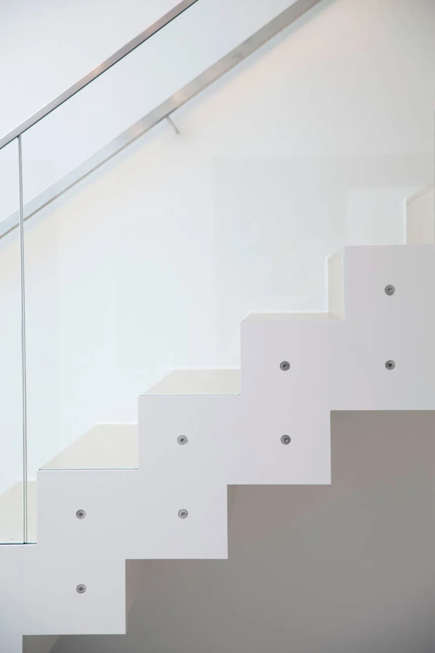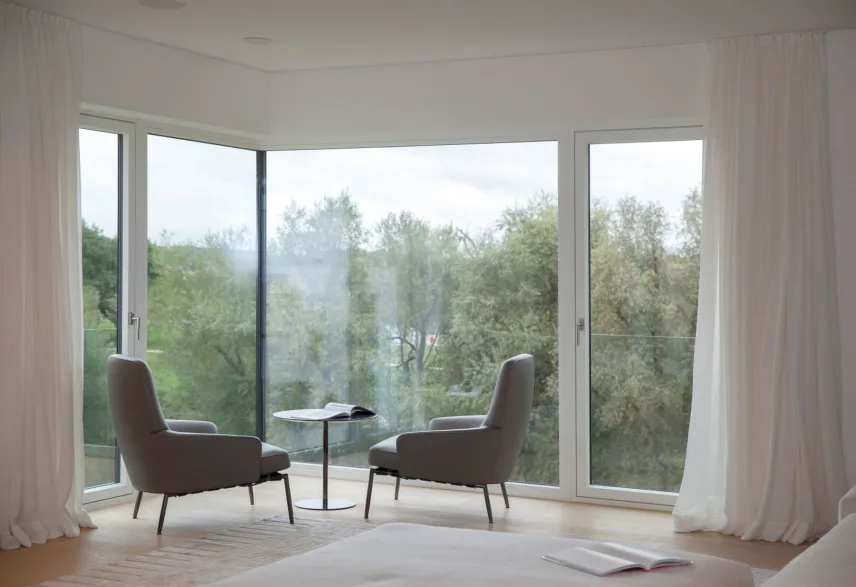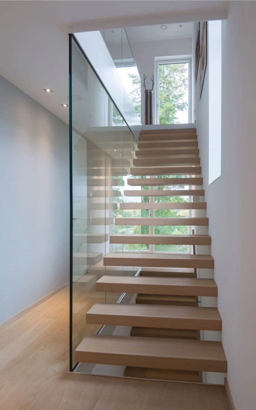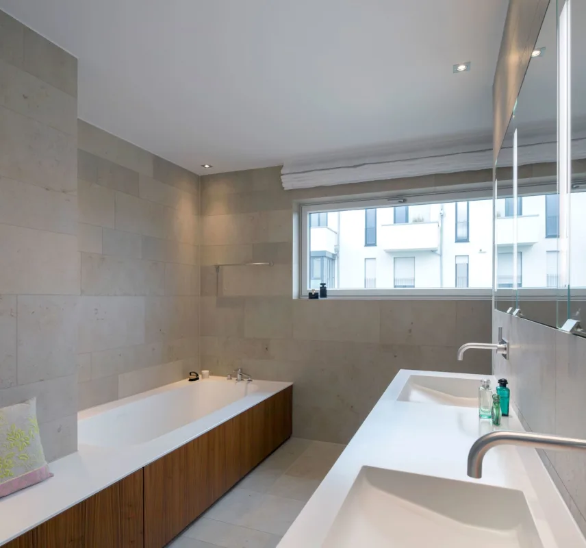 In der ersten Ebene öffnet sich ein zweigeschossiges Eingangsfoyer und lädt den Nutzer ein das Gebäude zu betreten und beide Wohneinheiten zu erschließen. In der 3. Ebene liegen die Schlafräume, Bad, Ankleide und Hauswirtschaftsraum. Von hier gelangt man über die frei kragende Treppe in das Wohngeschoss der 4. Ebene mit Küche, Essbereich, Arbeitsraum und Gäste-WC. Über eine Rohstahltreppe erweitert sich die Wohnung um einen Rückzugsraum im 5.Geschoss. hier gibt es einen Dachzugang mit großer Dachterrasse, Außenküche und 270°-Blick über Regensburg und den Naturraum der Donauauen. Werthaltige Materialien wie Eiche, Kalkstein, Corian, Kupfer, Glas und Rohstahl bilden zusammen mit den technischen Komponenten ein zeitgemäßes Wohnrefugium.