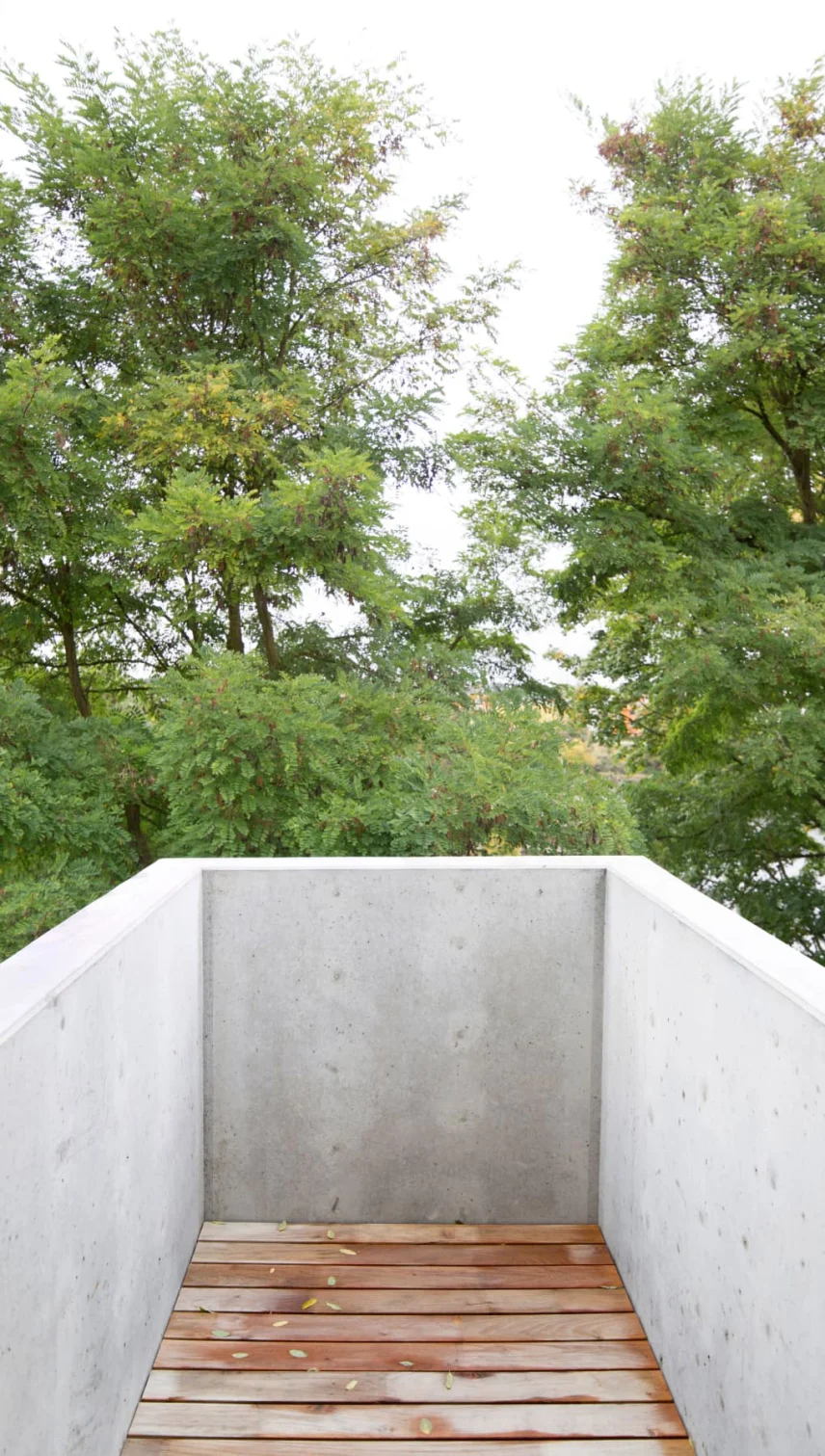 Das städtebauliche Konzept von bogevischs buero sieht eine dichte, urbane Qualität für das Quartier vor. Der massive Baukörper mit seiner Lochfassade wird nur an einer Ecke aufgerissen, um dort, hoch oben der 4. Ebene, eine Aussichtslounge vom Wohnbereich in die Donauauen zu bieten. Ansonsten strukturieren nur eine Loggia und zwei Sichtbetonbalkone die Fassade dreidimensional.